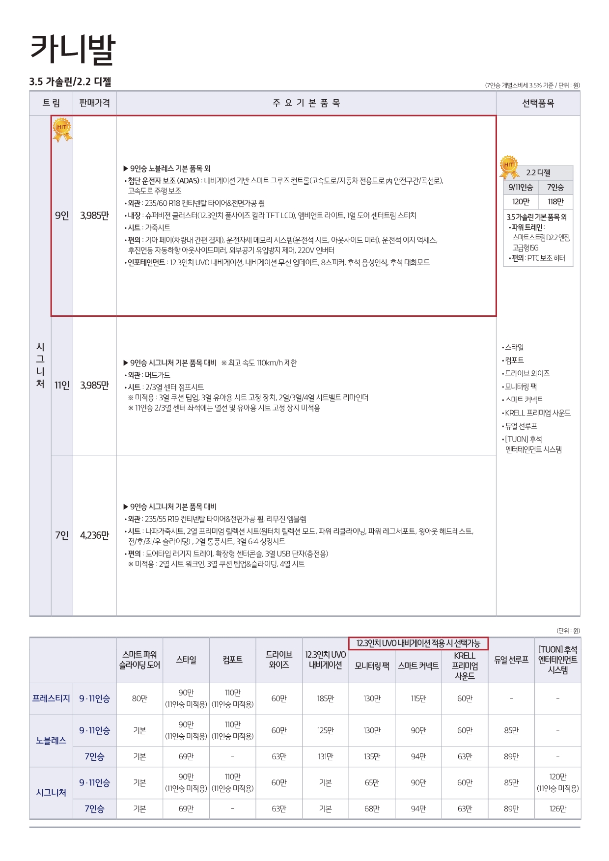 3.5가솔린과 2.2 디젤은 트림별 모든 사양 및 옵션이 일치합니다.
