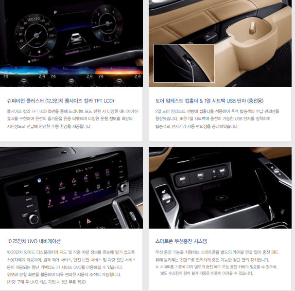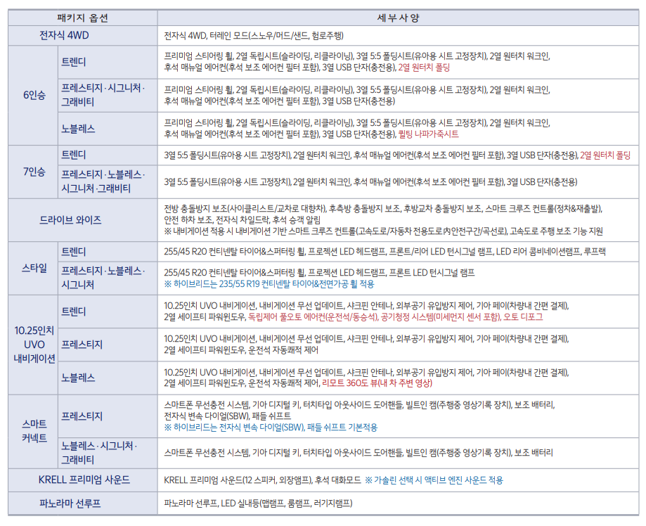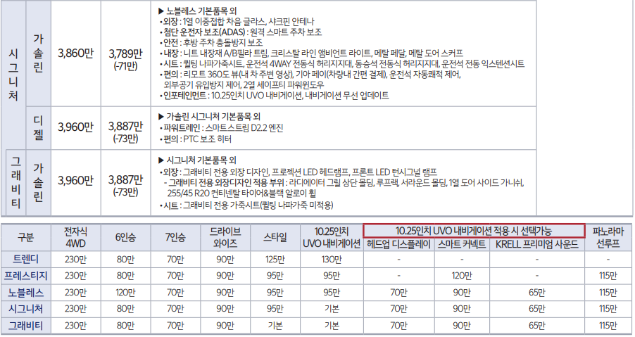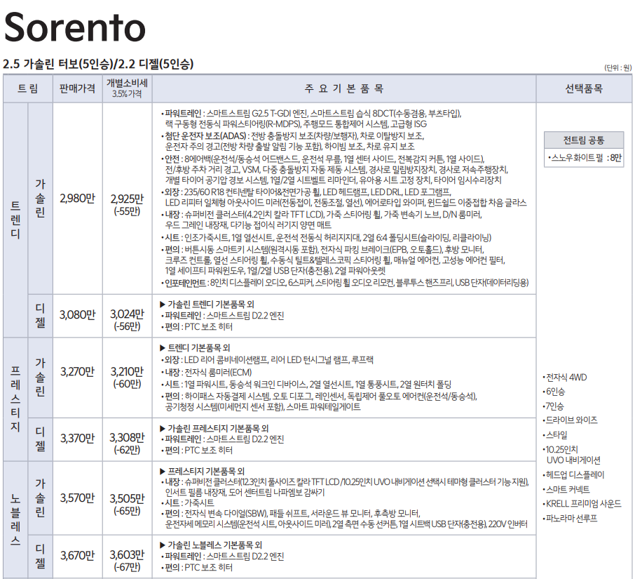 | 쏘렌토 트랜디 기본 품목 포함 이외 전자식 룸미러 1열 파워시트, 통풍시트 2열 열선시트, 원터치 폴딩 하이패스 자동결제 시스템 오토 디포그, 레인센서 스마트 트렁크 시스템 |