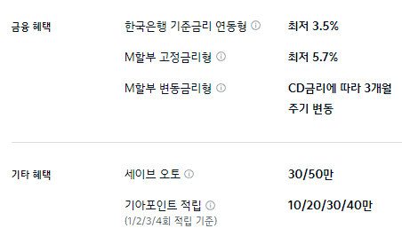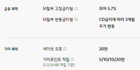 M할부 구매 혜택이 제공되며, 기타 혜택으로는 세이브 오토와 기아 포인트 적립 등의 혜택이 제공됩니다.