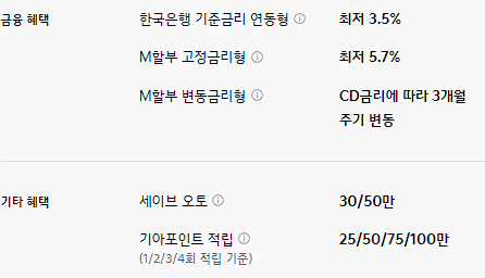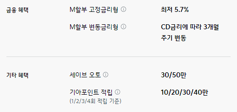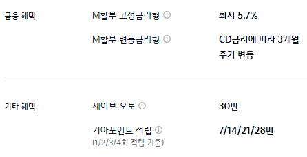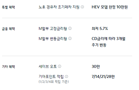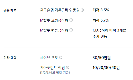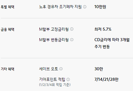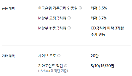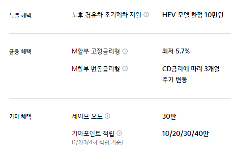 M할부 구매 혜택이 제공되며, 기타 혜택으로는 세이브 오토와 기아 포인트 적립 등의 혜택이 제공됩니다.