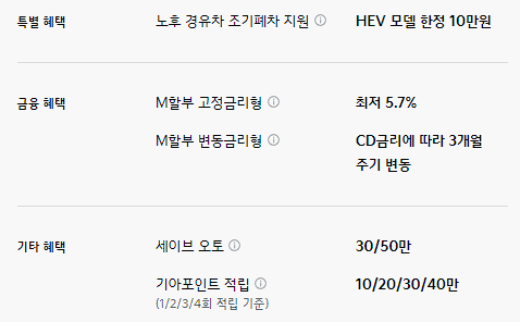 이외 세이브 오토, 기아 포인트 적립은 다른 차종들과 동일하게 제공됩니다.