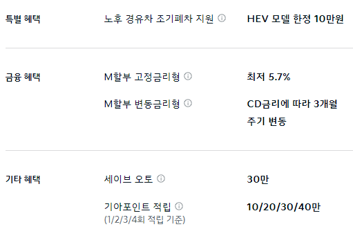 세이브 오토 혜택으로 30만원 할인이 가능하며, 기아 포인트 적립도 최대 40만 원까지 적립 가능합니다.