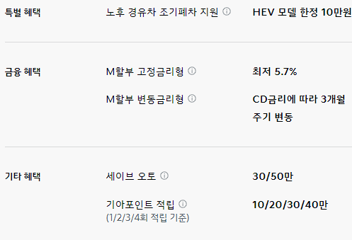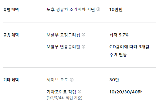 세이브 오토 혜택으로 30만원 할인이 가능하며, 기아 포인트 적립도 최대 40만 원까지 적립 가능합니다.