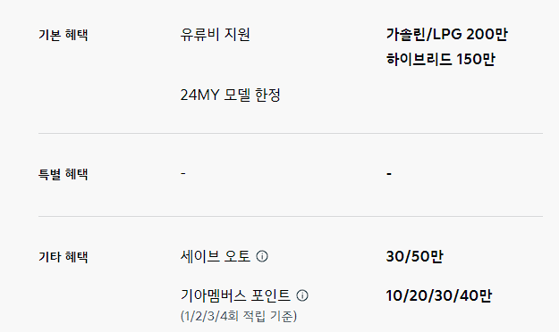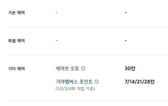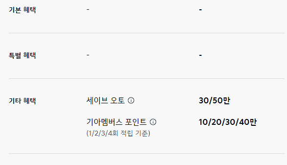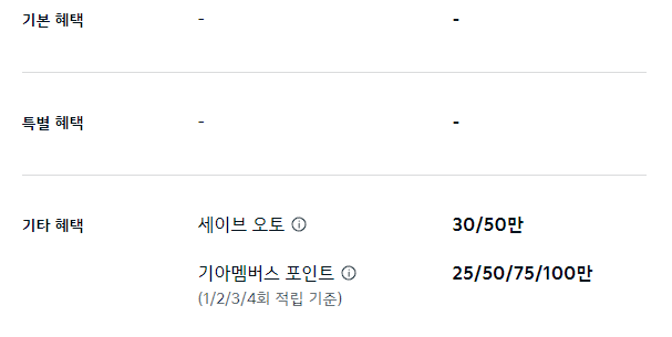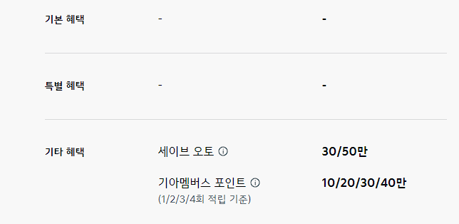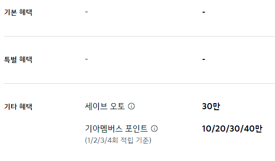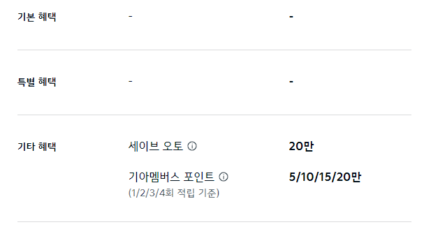 기타 혜택으로 세이브 오토, 기아멤버스 포인트를 최대 20만 원 제공합니다.
