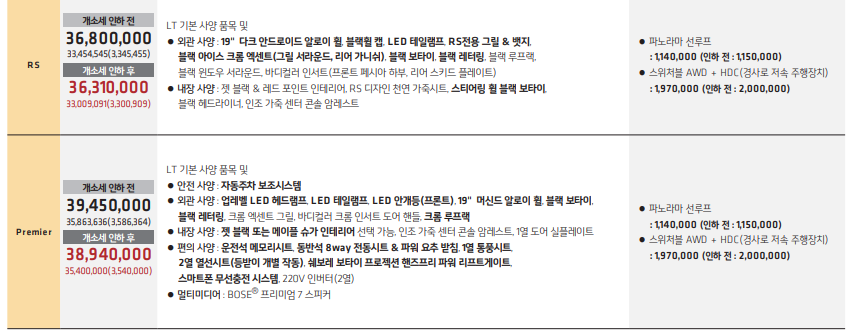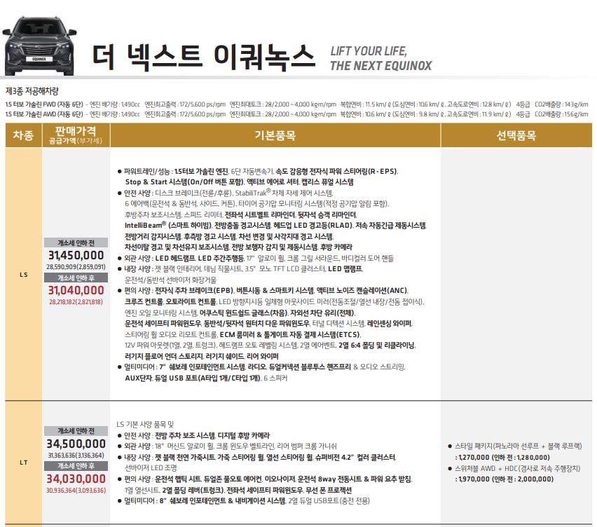 쉐보레 이쿼녹스는 ls, lt, rs, premier로 총 네 개의 트림으로 나누어져 있습니다. 각 트림별 가격은 다음과 같습니다.