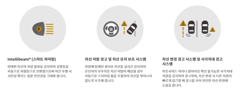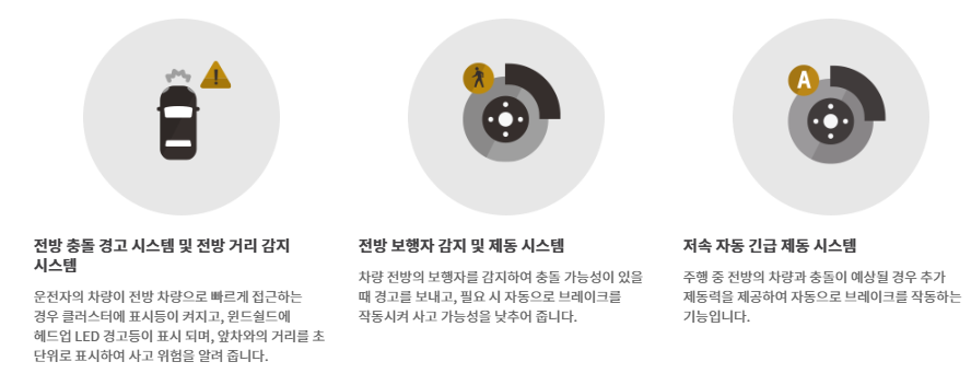 또한, 여러 가지 첨단 안전 사양들이 기본 적용되어 운전 시 위험한 상황을 감지하여 회피하고 경고해 주어 안전을 보장합니다.