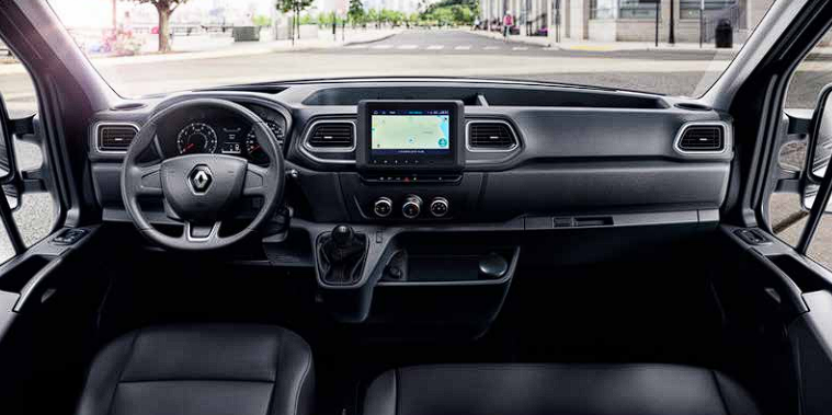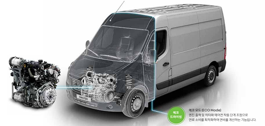 르노 마스터는 유로 6 기준을 준수하는 트윈 디젤엔진이 장착됩니다. 중저속구간의 강력한 토크와 고속구간의 뛰어난 가속력으로 밴에 최적화된 주행성능을 보여줍니다. 에코모드도 설정 가능하여 엔진 출력 및 히터와 에어컨 작동단계를 조정하여 연료 소비를 최적화하여 연비를 개선하는 기능도 담당합니다.