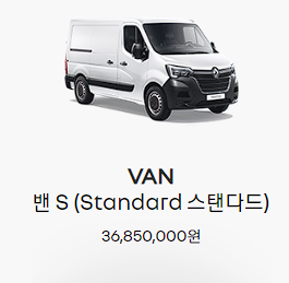 르노 마스터는 밴 차량이 판매중입니다. 밴 S와 밴 L 트림으로 나누어 판매 중이며, 3천만 원대 가격이 형성되어 있습니다. 과거에는 승합용으로도 출시하였지만, 현재는 마스터 밴 위주로 판매되고 있는 것을 르노 홈페이지르 통하여 확인할 수 있습니다.