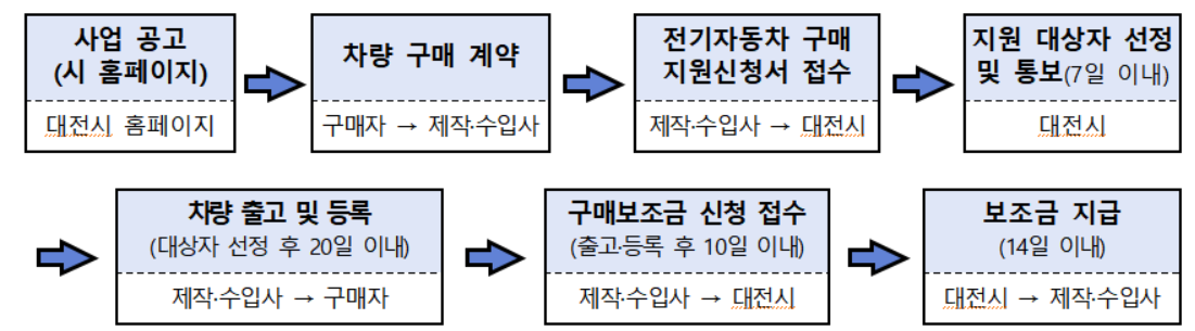 - 전기차 제작・수입사 : 접수된 신청서와 첨부서류 일체를 “저공해차 구매보조금 지원시스템”을 통하여 대전시에 신청
