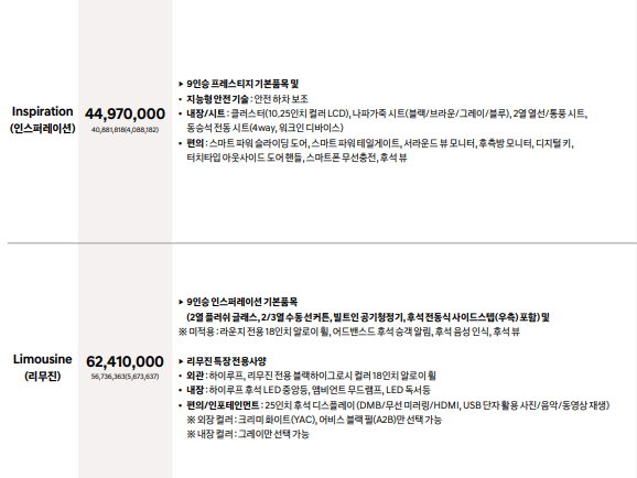 스타리아 라운지는 9인승과 7인승으로 구분됩니다.