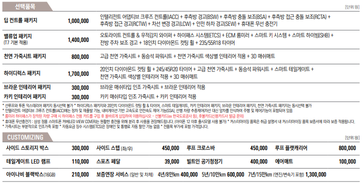 상위 트림인 t7에는 18인치 휠, 오토 라이트 컨트롤, 하이패스, 통풍시트 등이 적용되 편의성을 높이고 있습니다.