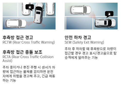 쌍용 토레스는 긴급 제동 보조 기능, 후측방 경고, 후측방 충돌 보조, 후측방 접근 경고, 후측방 접근 충돌 보조, 안전 하차 경고 등의 편의사양이 적용되었습니다.