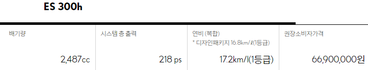 es300h 배기량은 2,500cc이며 출력은 218마력입니다.