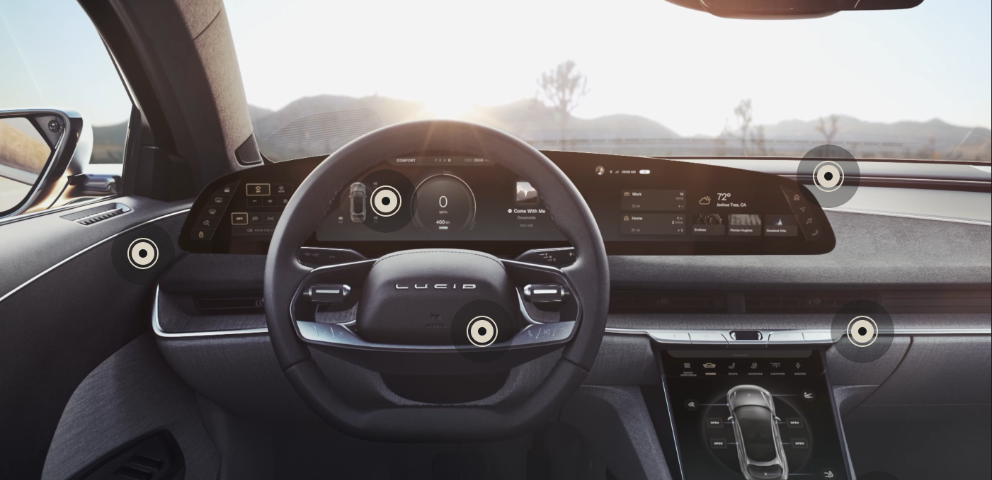 루시드 에어(Lucid Air)는 세계 유일의 탄소 중립 천연 가죽 생산업체인 나파(Nappa), 프리미엄 가죽의 부드러운 결, 그리고 독특한 천공 패턴을 가진 정교한 PurLuxe 가죽 대안(나중에 사용 가능) 등 정교한 인테리어 옵션을 제공합니다.