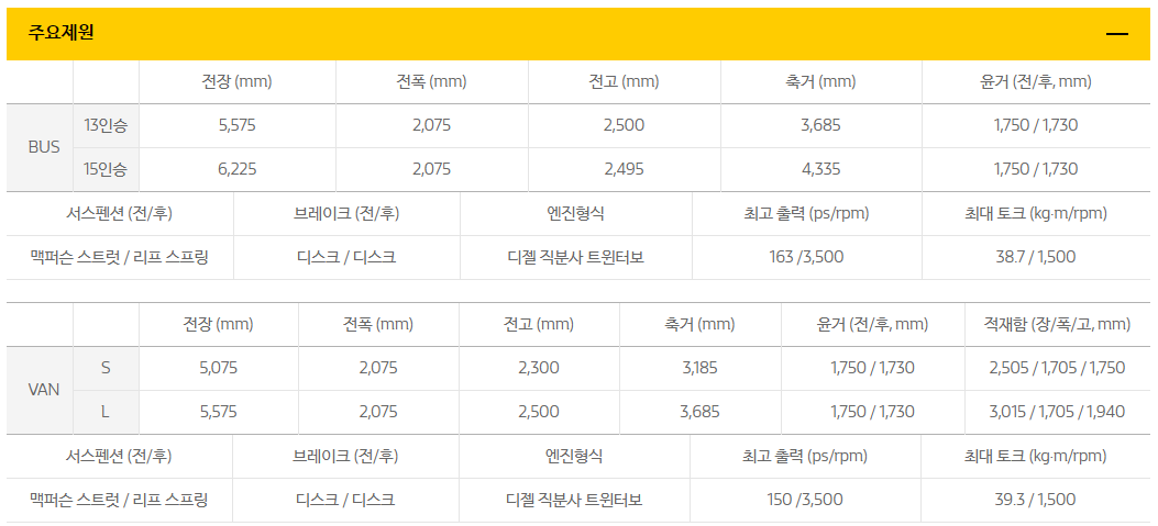 옵션이나 구성품은 동일하고, 단지 화물칸의 적재용량에 따라 두 가지 모델로 구분되고 있습니다.
