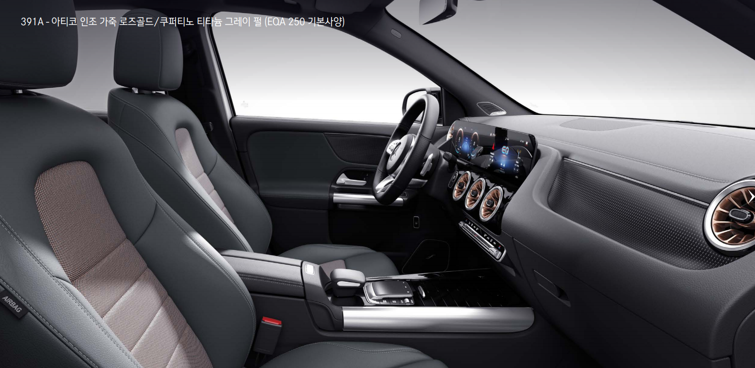 실내는 로즈골드, 티타늄 그레이 펄 색상의 인조 가족 시트가 기본 제공됩니다.