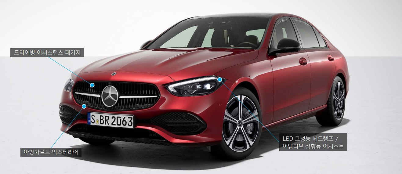c클래스 외부 디자인은 날카로운 led 헤드라이드, 주간 주행 등이 적용되었습니다.