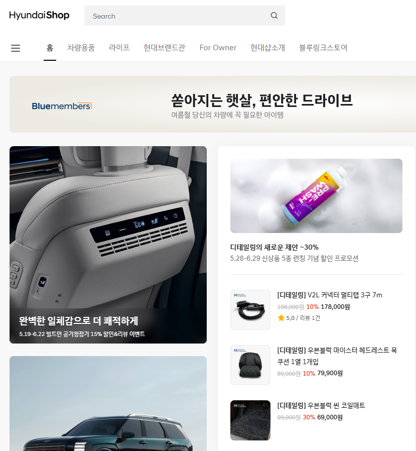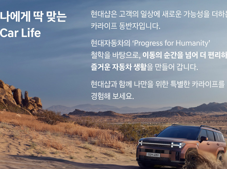 현대자동차 보유고객을 위한 맞춤형 쇼핑몰, 현대샵! 나에게 딱 맞는 카라이프를 위한 차량용품부터 가전, 라이프스타일까지. 블루멤버스 포인트로 혜택도 더하세요.