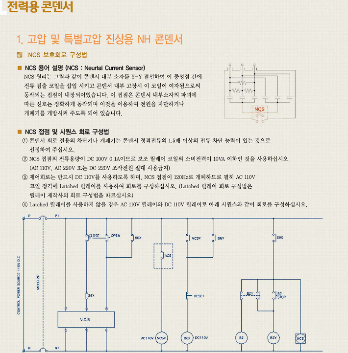 ncs 원리는 콘덴서 내부 소자를 Y-Y 결선하여 이 중성점 간에 전류 점출 코일을 삽입 시키고 콘덴서 내부 고장시 이 코일이 여자됨으로써 동작되늰 접점이 내장되어 있습니다. 이 접점은 콘덴서 내부 소자의 파괴에 따른 신호는 정확하게 동작되며 이것을 이용하여 전원을 차단하거나 개폐기를 개방시켜 주도록 되어 있습니다.