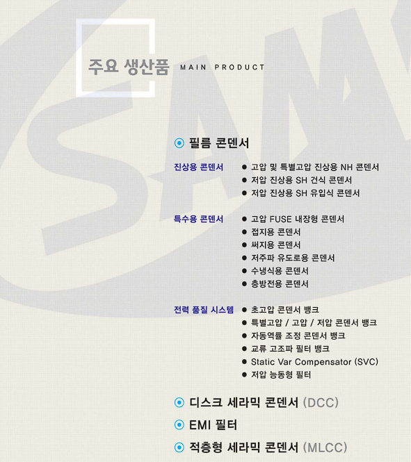 주요 생산품은 필름 콘덴서(진상용 콘덴서, 특수용 콘덴서, 전력 품질 시스템), 디스크 세라믹 콘덴서, emi 필터, 적층형 세라믹 콘덴서 등이 있습니다.