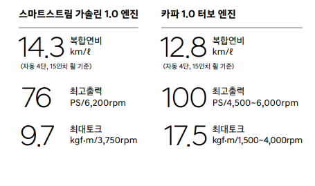 1.0 가솔린 엔진과 1.0 가솔린 터보 엔진으로 나누어져 있습니다.