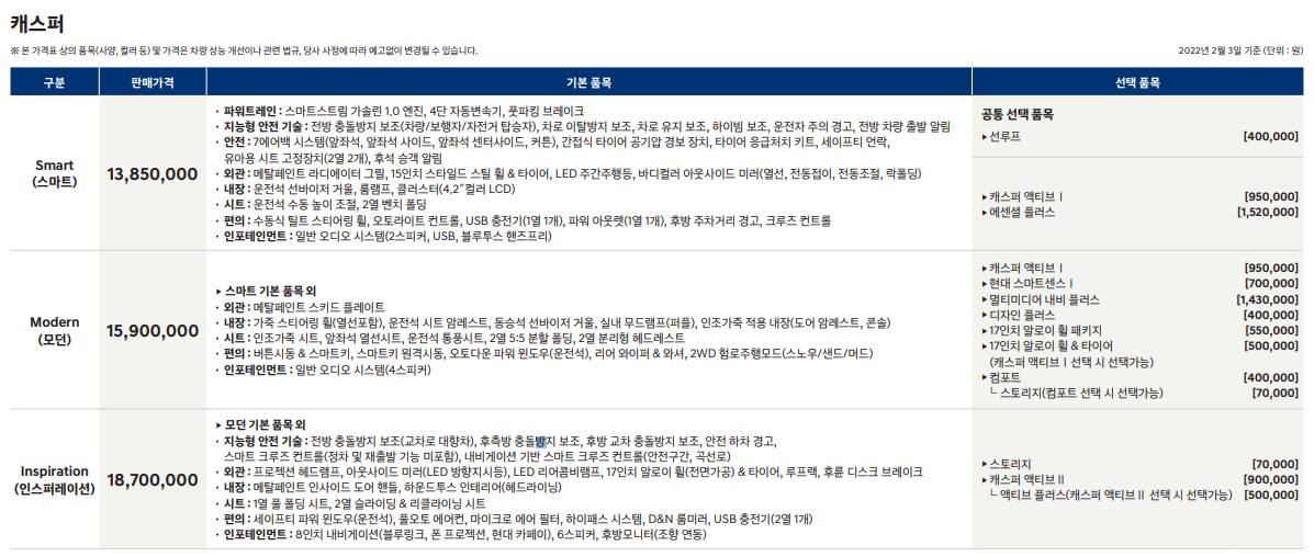 현대 경차 캐스퍼는 3가지 트림으로 나누어 판매 중입니다.