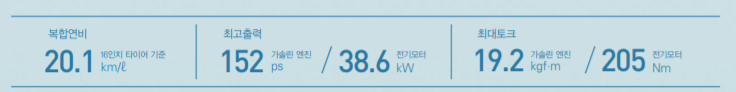 하이브리드 시스템에 2.0 가솔린 엔진을 기본으로 사양에 따라 다르게 판매하고 있습니다.