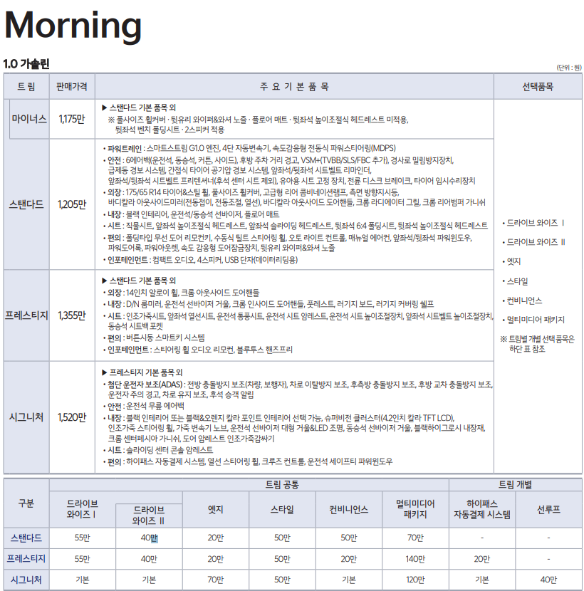 2022 모닝은 스탠더드, 프레스티지, 시그니처로 나누어 판매되고 있습니다.