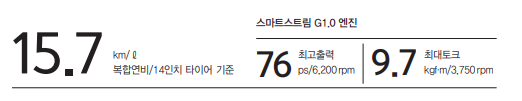 최고 출력은 76마력, 9.7 최대 토크를 보여줍니다.