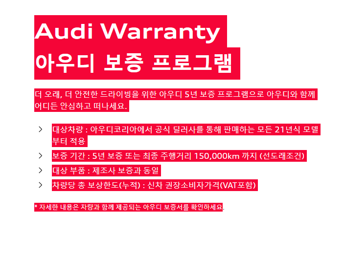 아우디 프로모션은 딜러사 별로 차이를 보이고 있습니다. 공통적으로 적용되는 프로모션은 보증 프로그램 연장입니다.
