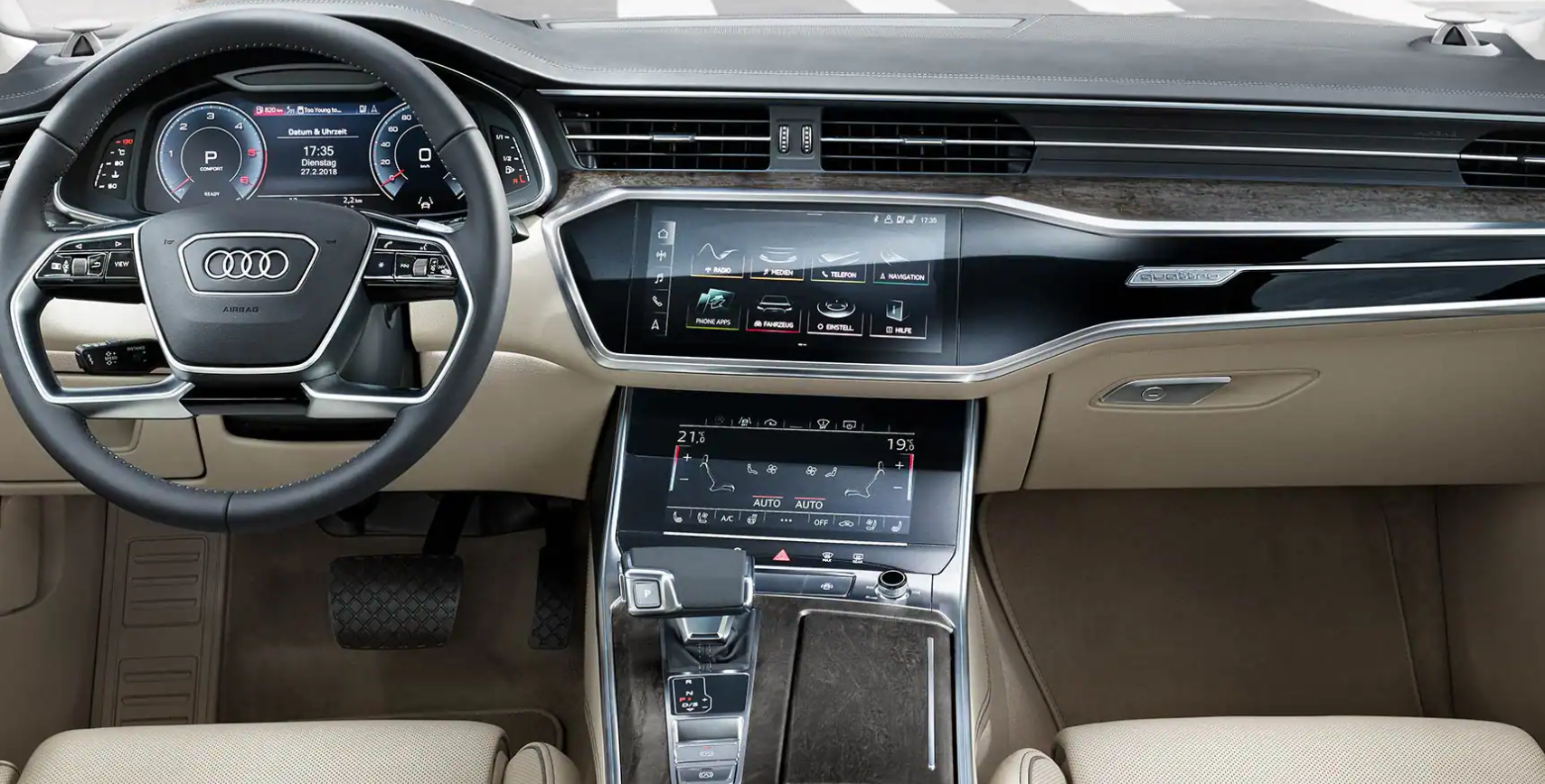 아우디 실내 디자인은 깔끔하고 세련된 모습을 보여줍니다. 10.2인치 디스플레이 계기판은 주행 정보를 잘 전달해주고 있습니다. 센터패시아는 두 개의 모니터로 나누어져 내비게이션, 공조 제어의 기능을 제공합니다.