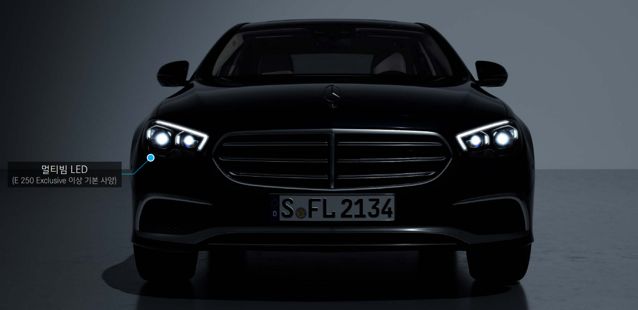 또한, e클래스 익스클루시브 모델은 멀티빔 led를 적용하여 야간 시야 확보에도 큰 도움이 됩니다.