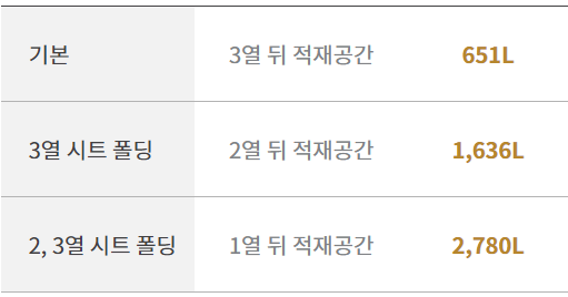 트렁크 용량은 2열까지 폴딩 시 2780L로 많은 적재용량을 보유합니다.