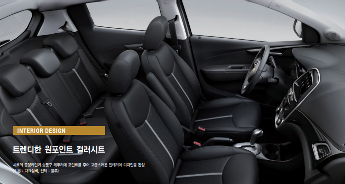 스파크 실내 인테리어 역시 인조가죽, 직물시트, 블루포인트 등 다양한 실내 디자인이 옵션에 따라 적용되고 있습니다.