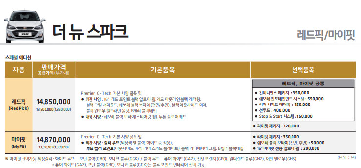 더 뉴 스파크 프리미어 등급 옵션 구성 및 가격