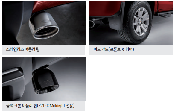 쉐보레 콜로라도는 트림에 따라서 오프로드 사이드 스텝, 스테인리스 머플러, 머드가드 등의 액세서리가 선택 가능합니다.