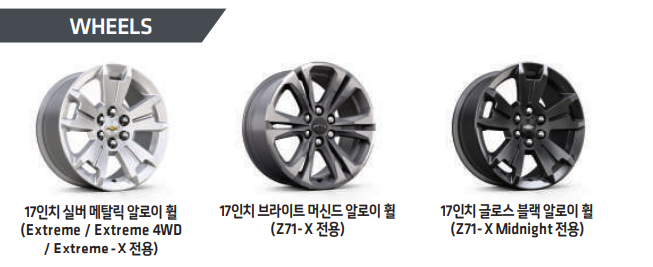 쉐보레 콜로라도는 픽업트럭이며 3가지 휠 디자인 선택이 가능합니다.