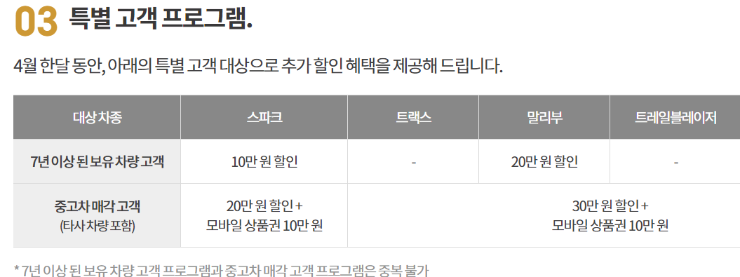 이러한 혜택도 스파크, 트랙스, 말리부, 트레일블레이저에 한하여 할인이 적용됩니다.
