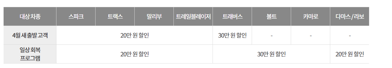 스파크, 트랙스, 말리부, 트레일블레이저 4월 구매 혜택, 판매조건