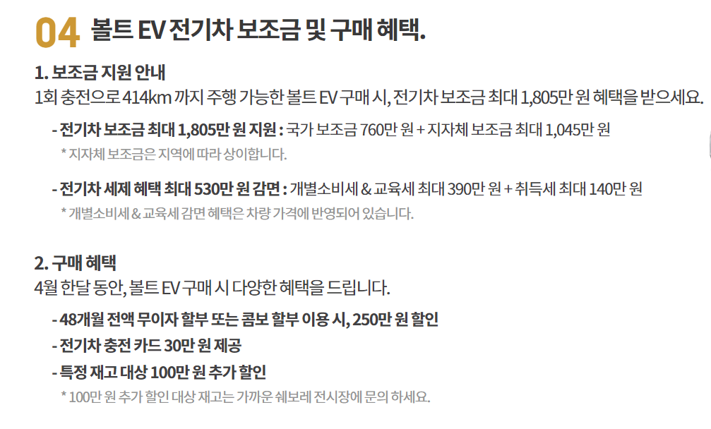 1에서 언급한 보조금 지원 외에 쉐보레에서 전기차 볼트에게 4월 한 달 동안, 볼트 EV 구매 시 다양한 혜택을 드립니다.