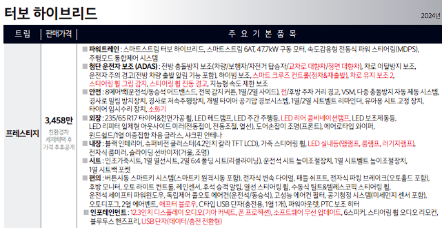스포티지 하이브리드 프레스티지는 스마트스트림 터보 하이브리드 엔진을 기본으로 합니다. 전방 충돌방지 보조, 스마트 크루즈 컨트롤, 차로 유지 보조 2, 17인치 휠, led 헤드램프, 버튼 시동 스마트키, 12.3인치 디스플레이 오디오, 오토 디포그 등의 옵션이 기본 탑재됩니다.