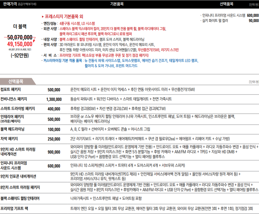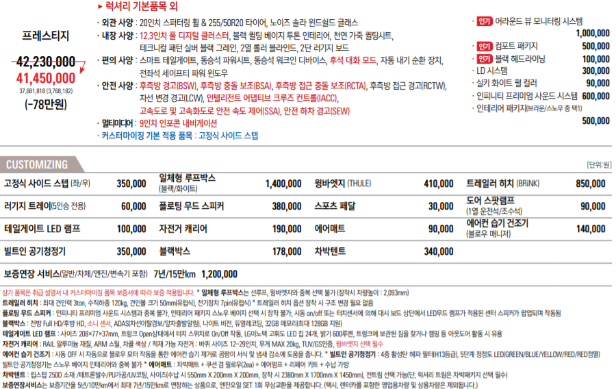 | ▶ 프레스티지 기본품목 외 •엔진/성능 : 4륜구동 시스템, LD 시스템 •외관 사양 : 스페이스 블랙 익스테리어 컬러, 20인치 더 블랙 전용 블랙 휠, 블랙 라디에이터 그릴, 블랙 하이그로시 패션 루프랙, 블랙 하이그로시 로워 범퍼 •내장 사양 : 블랙 스웨이드 퀼팅 인테리어, 램프 도어 스커프, 블랙 헤드라이닝 •편의 사양 : 3D 어라운드 뷰 모니터링 시스템, 운전석 이지 억세스, 운전석 메모리 시트, 후진 연동 하향 아웃사이드 미러, 터치 센싱 도어핸들(1/2열), 무선충전기(15W), 러기지 스크린 •서 비 스 : 프리미엄 기프트 팩(소모성 부품 무상교환 쿠폰 및 정기 점검 패키지) •커스터마이징 기본 적용 품목 : 뉴 전동식 파워 사이드스텝, 도어스팟램프, 에어컨 습기 건조기, 테일게이트 LED 램프, 휠아치 & 도어 가니쉬, 프런트 머드가드 |