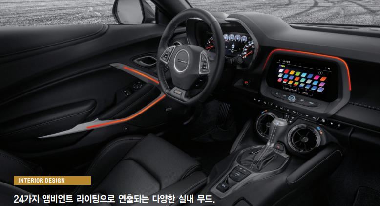 쉐보레 카마로는 스포츠카로 실내는 운전석 중심으로 디자인되어 있는 모습을 알 수 있으며