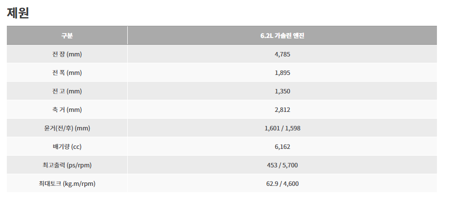기본 모델의 가격이 5,529만 원으로 다소 비싼 편인데요, 하지만 v8 엔진에 엄청난 힘을 보여주고 있는 만큼 일부에서는 가성비 차량으로 불리기도 합니다.