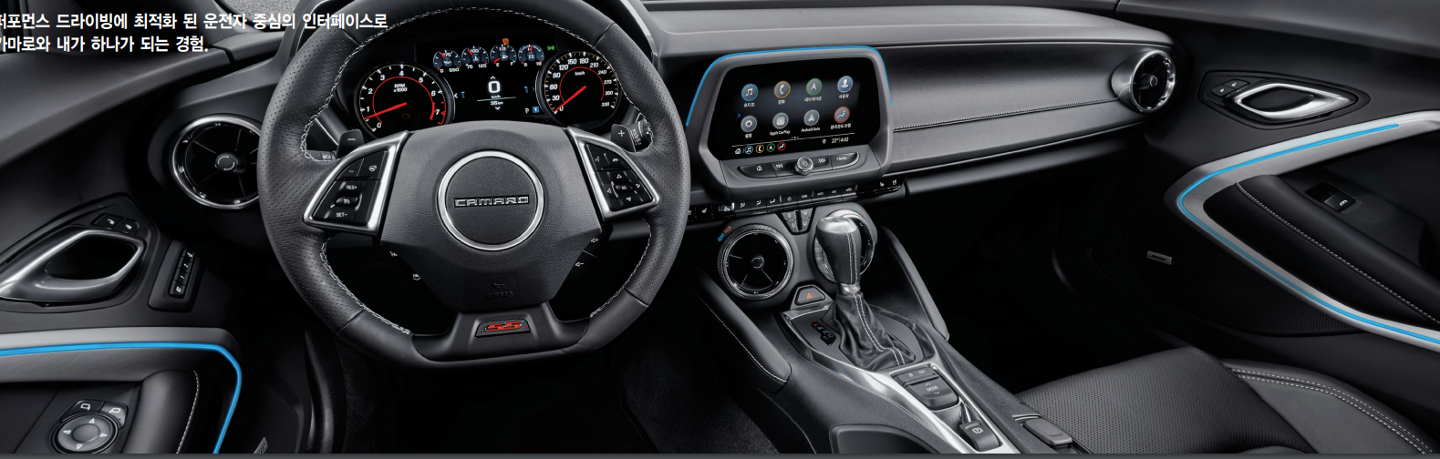 쉐보레 카마로는 스포츠카로 실내는 운전석 중심으로 디자인되어 있는 모습을 알 수 있으며