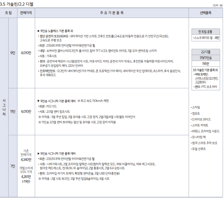 카니발은 승차 인원에 따라서 판매 가격과 구성 옵션 품목도 다르게 책정되었습니다.