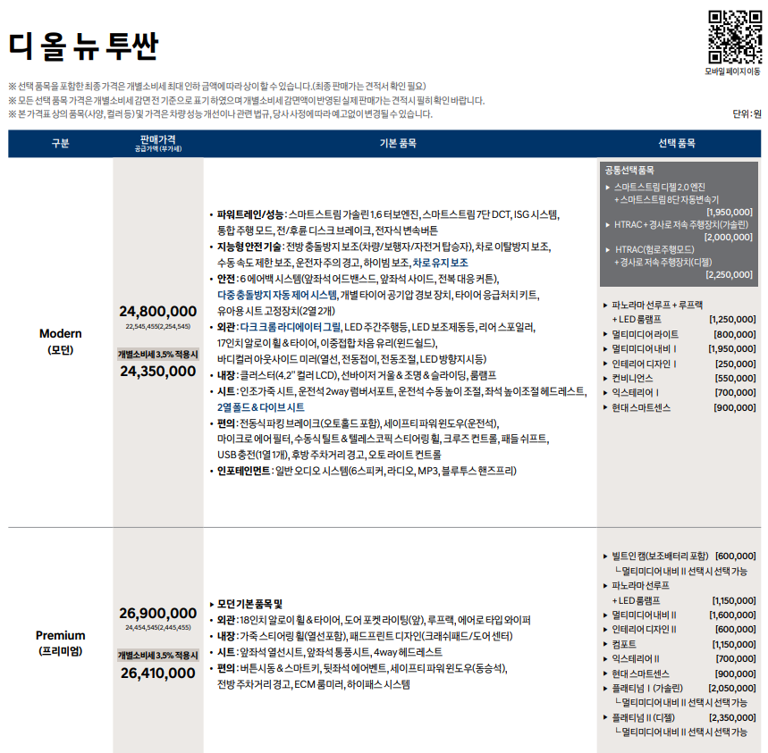 투싼 가솔린, 디젤은 모던, 프리미엄, 인스퍼레이션으로 3가지 트림으로 나누어져 판매 중입니다.