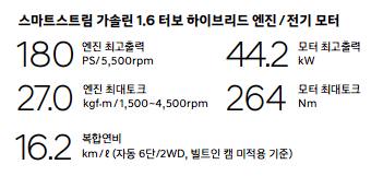 하지만, 1.6 가솔린 터보 하이브리드 엔진의 출력이 더 높기에 크게 차이 나지 않은 가격이라면 투싼 급 이상의 하이브리드 suv 차량을 추천합니다.