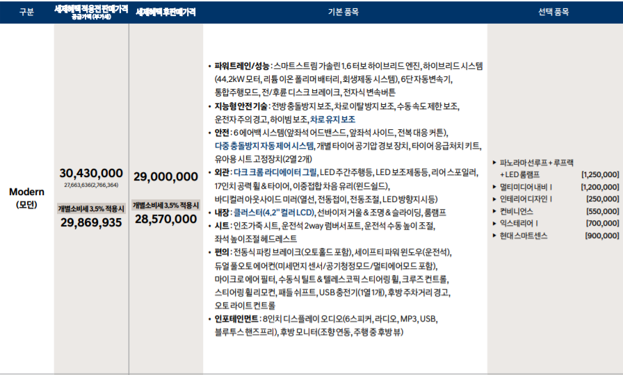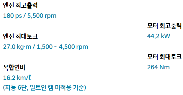 • 파워트레인/성능 : 스마트스트림 가솔린 1.6 터보 하이브리드 엔진, 하이브리드 시스템