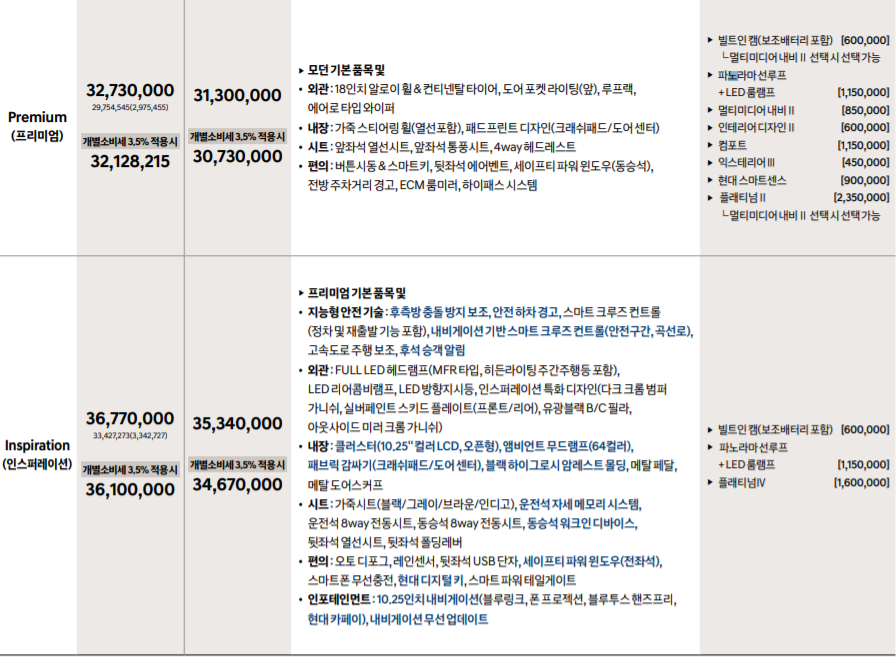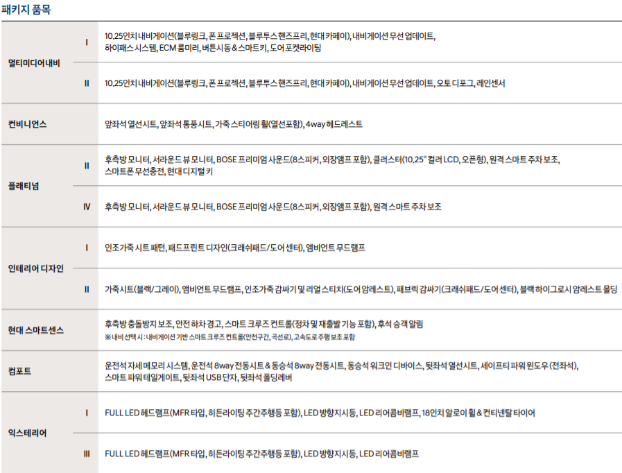 • 내장 : 클러스터(10.25'' 컬러 LCD, 오픈형), 앰비언트 무드램프(64컬러),
